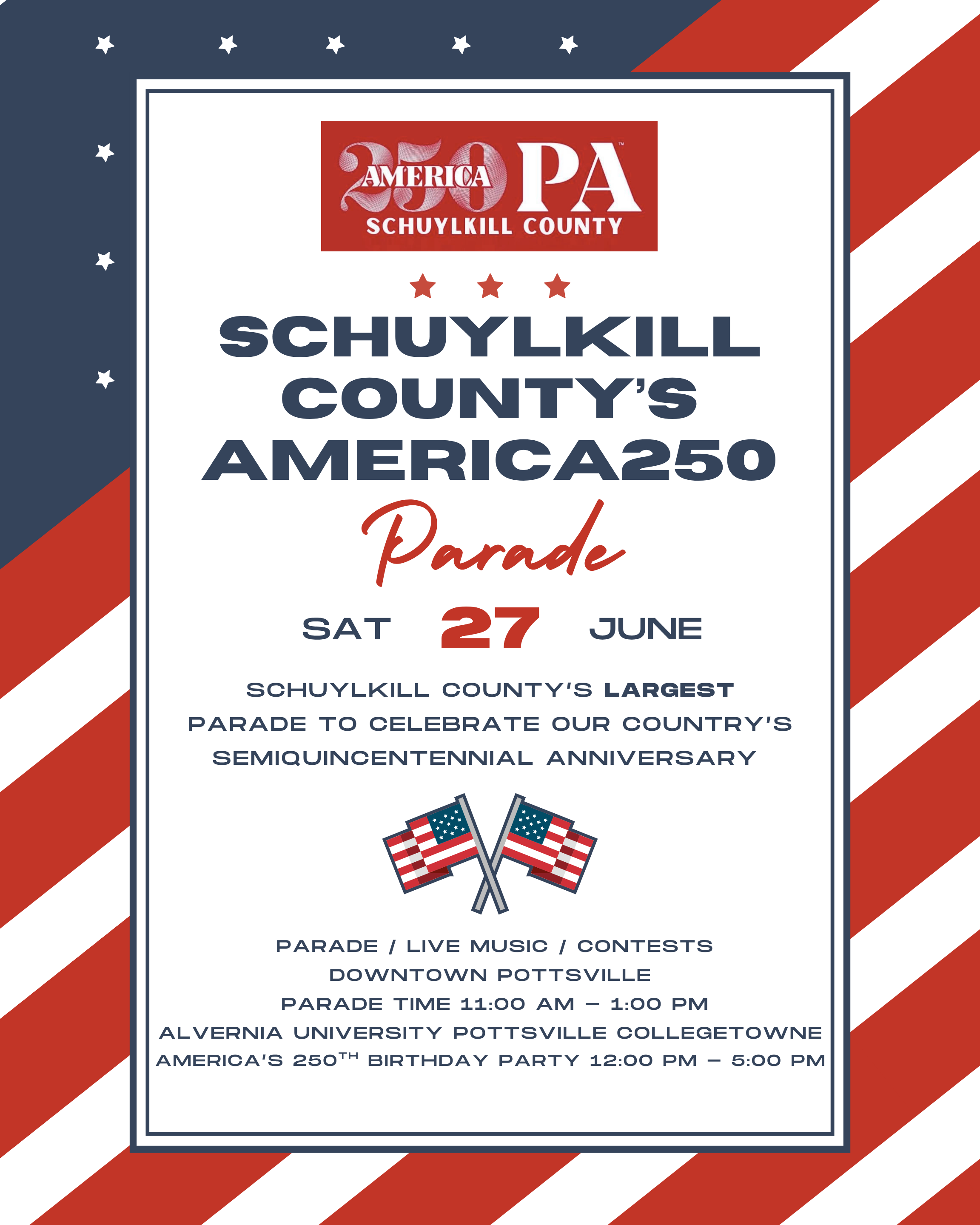 Join us on Saturday, June 27 for a historic day in Pottsville as we celebrate America’s 250th anniversary with Schuylkill County’s largest parade ever!